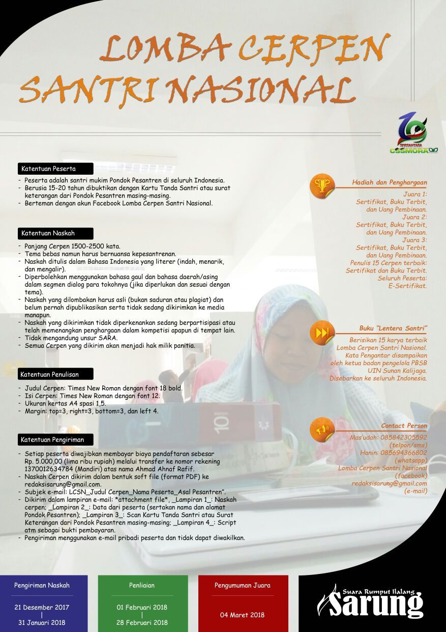 Departemen Jurnalistik dan Redaksi SARUNG (Suara Rumput Ilalang) CSSMoRA UIN Sunan Kalijaga mempersembahkan LOMBA CERPEN SANTRI NASIONAL bagi seluruh santri di penjuru Indonesia.